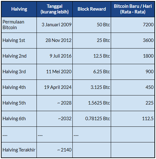 Dapat kita lihat bahwa setiap kurang lebih empat tahun, Bitcoin baru yang tercipta setiap harinya akan berkurang. Hingga akhirnya pada tahun 2140, Bitcoin terakhir akan ditambang pada Halving ke-64.