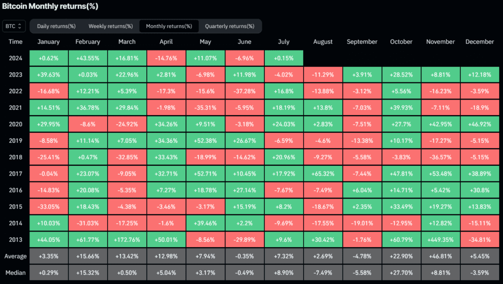 Jika kita perhatikan data kinerja Bitcoin dari Coinglass menunjukkan, Juli secara historis menunjukkan tren positif, berbeda dengan Juni yang cenderung bearish. Sejak tahun 2013 hingga 2024, Bitcoin umumnya mengalami kinerja harga yang positif di bulan Juli, baik dari kinerja median maupun kinerja rata-ratanya.